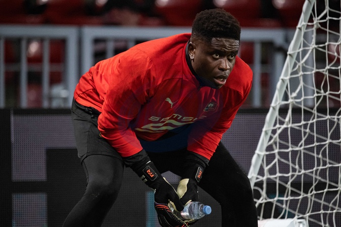 Brice Samba (Stade Rennais) - Match de Ligue 1 McDonald's "Rennes - Lille (0-2)" au Roazhon Park, le 16 février 2025. Huit mois après son malaise cardio-respiratoire, le milieu de terrain Nabil Bentaleb, autorisé à jouer avec un défibrilateur, une première en Ligue 1, a ouvert le score pour son grand retour avec son équipe du LOSC. Ligue 1 McDonald's match "Rennes - Lille (0-2)" at Roazhon Park, February 16, 2025. Eight months after his cardio-respiratory malaise, midfielder Nabil Bentaleb, authorized to play with a defibrillator, a first in Ligue 1, opened the scoring for his big comeback with his LOSC team.