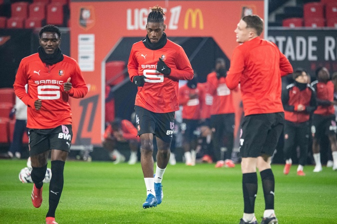 Christopher Wooh (Stade Rennais) - Match de Ligue 1 McDonald's "Rennes - Lille (0-2)" au Roazhon Park, le 16 février 2025. Huit mois après son malaise cardio-respiratoire, le milieu de terrain Nabil Bentaleb, autorisé à jouer avec un défibrilateur, une première en Ligue 1, a ouvert le score pour son grand retour avec son équipe du LOSC. Ligue 1 McDonald's match "Rennes - Lille (0-2)" at Roazhon Park, February 16, 2025. Eight months after his cardio-respiratory malaise, midfielder Nabil Bentaleb, authorized to play with a defibrillator, a first in Ligue 1, opened the scoring for his big comeback with his LOSC team.