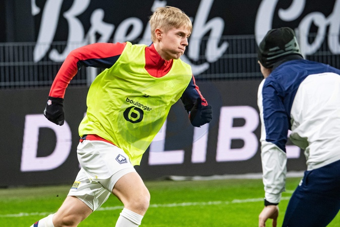 Hakon Arnar Haraldsson (Lille OSC) - Match de Ligue 1 McDonald's "Rennes - Lille (0-2)" au Roazhon Park, le 16 février 2025. Huit mois après son malaise cardio-respiratoire, le milieu de terrain Nabil Bentaleb, autorisé à jouer avec un défibrilateur, une première en Ligue 1, a ouvert le score pour son grand retour avec son équipe du LOSC. Ligue 1 McDonald's match "Rennes - Lille (0-2)" at Roazhon Park, February 16, 2025. Eight months after his cardio-respiratory malaise, midfielder Nabil Bentaleb, authorized to play with a defibrillator, a first in Ligue 1, opened the scoring for his big comeback with his LOSC team.