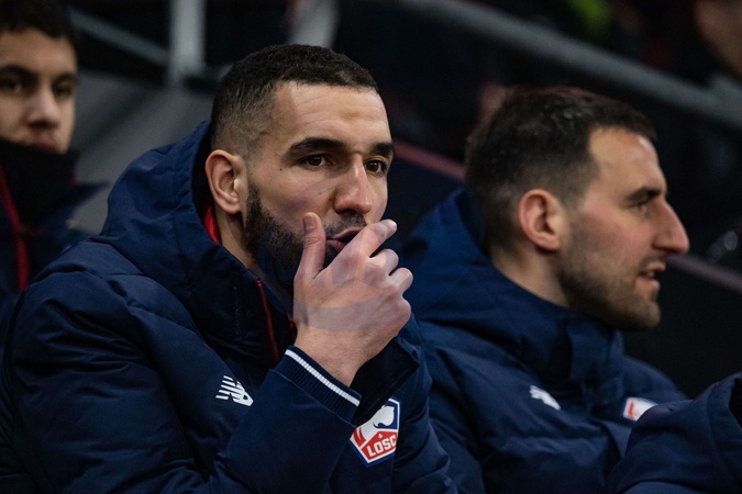 Nabil Bentaleb (Lille OSC) - Match de Ligue 1 McDonald's "Rennes - Lille (0-2)" au Roazhon Park, le 16 février 2025. Huit mois après son malaise cardio-respiratoire, le milieu de terrain Nabil Bentaleb, autorisé à jouer avec un défibrilateur, une première en Ligue 1, a ouvert le score pour son grand retour avec son équipe du LOSC. Ligue 1 McDonald's match "Rennes - Lille (0-2)" at Roazhon Park, February 16, 2025. Eight months after his cardio-respiratory malaise, midfielder Nabil Bentaleb, authorized to play with a defibrillator, a first in Ligue 1, opened the scoring for his big comeback with his LOSC team.