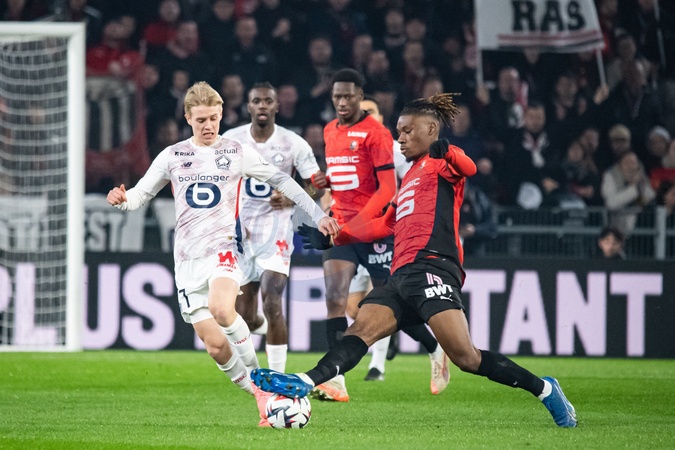 Christopher Wooh (Stade Rennais) Hakon Arnar Haraldsson (Lille OSC) - Match de Ligue 1 McDonald's "Rennes - Lille (0-2)" au Roazhon Park, le 16 février 2025. Huit mois après son malaise cardio-respiratoire, le milieu de terrain Nabil Bentaleb, autorisé à jouer avec un défibrilateur, une première en Ligue 1, a ouvert le score pour son grand retour avec son équipe du LOSC. Ligue 1 McDonald's match "Rennes - Lille (0-2)" at Roazhon Park, February 16, 2025. Eight months after his cardio-respiratory malaise, midfielder Nabil Bentaleb, authorized to play with a defibrillator, a first in Ligue 1, opened the scoring for his big comeback with his LOSC team.