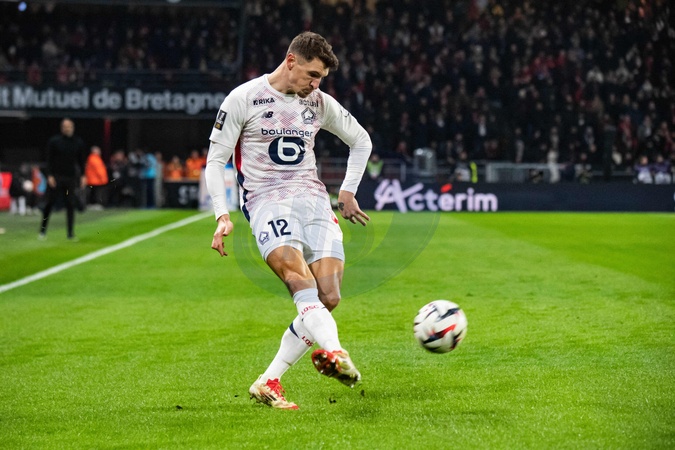 Thomas Meunier (Lille OSC) - Match de Ligue 1 McDonald's "Rennes - Lille (0-2)" au Roazhon Park, le 16 février 2025. Huit mois après son malaise cardio-respiratoire, le milieu de terrain Nabil Bentaleb, autorisé à jouer avec un défibrilateur, une première en Ligue 1, a ouvert le score pour son grand retour avec son équipe du LOSC. Ligue 1 McDonald's match "Rennes - Lille (0-2)" at Roazhon Park, February 16, 2025. Eight months after his cardio-respiratory malaise, midfielder Nabil Bentaleb, authorized to play with a defibrillator, a first in Ligue 1, opened the scoring for his big comeback with his LOSC team.