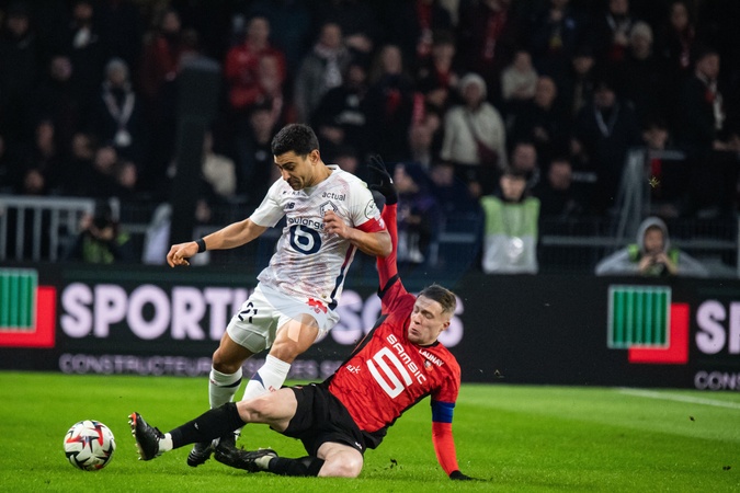 Benjamin André (Lille OSC) Adrien Truffert (Stade Rennais) - Match de Ligue 1 McDonald's "Rennes - Lille (0-2)" au Roazhon Park, le 16 février 2025. Huit mois après son malaise cardio-respiratoire, le milieu de terrain Nabil Bentaleb, autorisé à jouer avec un défibrilateur, une première en Ligue 1, a ouvert le score pour son grand retour avec son équipe du LOSC. Ligue 1 McDonald's match "Rennes - Lille (0-2)" at Roazhon Park, February 16, 2025. Eight months after his cardio-respiratory malaise, midfielder Nabil Bentaleb, authorized to play with a defibrillator, a first in Ligue 1, opened the scoring for his big comeback with his LOSC team.