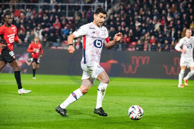 Benjamin André (Lille OSC) - Match de Ligue 1 McDonald's "Rennes - Lille (0-2)" au Roazhon Park, le 16 février 2025. Huit mois après son malaise cardio-respiratoire, le milieu de terrain Nabil Bentaleb, autorisé à jouer avec un défibrilateur, une première en Ligue 1, a ouvert le score pour son grand retour avec son équipe du LOSC. Ligue 1 McDonald's match "Rennes - Lille (0-2)" at Roazhon Park, February 16, 2025. Eight months after his cardio-respiratory malaise, midfielder Nabil Bentaleb, authorized to play with a defibrillator, a first in Ligue 1, opened the scoring for his big comeback with his LOSC team.