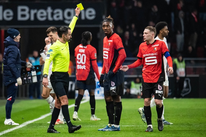 Romain Lissorgue (Arbitre Central) Christopher Wooh (Stade Rennais) Adrien Truffert (Stade Rennais) - Match de Ligue 1 McDonald's "Rennes - Lille (0-2)" au Roazhon Park, le 16 février 2025. Huit mois après son malaise cardio-respiratoire, le milieu de terrain Nabil Bentaleb, autorisé à jouer avec un défibrilateur, une première en Ligue 1, a ouvert le score pour son grand retour avec son équipe du LOSC. Ligue 1 McDonald's match "Rennes - Lille (0-2)" at Roazhon Park, February 16, 2025. Eight months after his cardio-respiratory malaise, midfielder Nabil Bentaleb, authorized to play with a defibrillator, a first in Ligue 1, opened the scoring for his big comeback with his LOSC team.