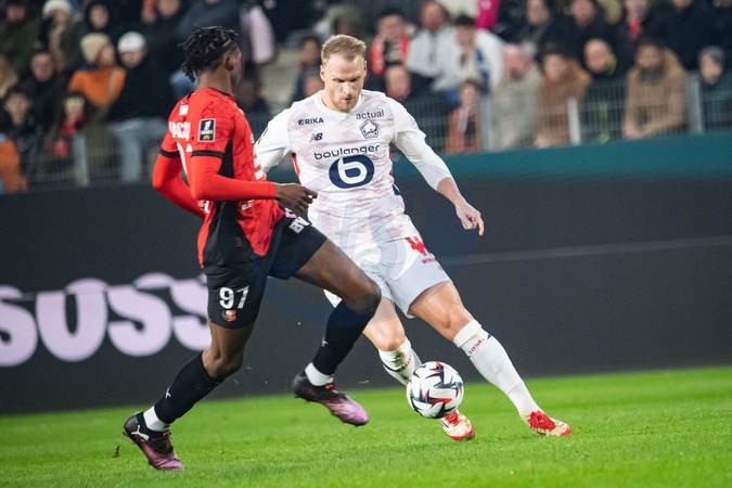 Mitchel Bakker (Lille OSC) - Match de Ligue 1 McDonald's "Rennes - Lille (0-2)" au Roazhon Park, le 16 février 2025. Huit mois après son malaise cardio-respiratoire, le milieu de terrain Nabil Bentaleb, autorisé à jouer avec un défibrilateur, une première en Ligue 1, a ouvert le score pour son grand retour avec son équipe du LOSC. Ligue 1 McDonald's match "Rennes - Lille (0-2)" at Roazhon Park, February 16, 2025. Eight months after his cardio-respiratory malaise, midfielder Nabil Bentaleb, authorized to play with a defibrillator, a first in Ligue 1, opened the scoring for his big comeback with his LOSC team.