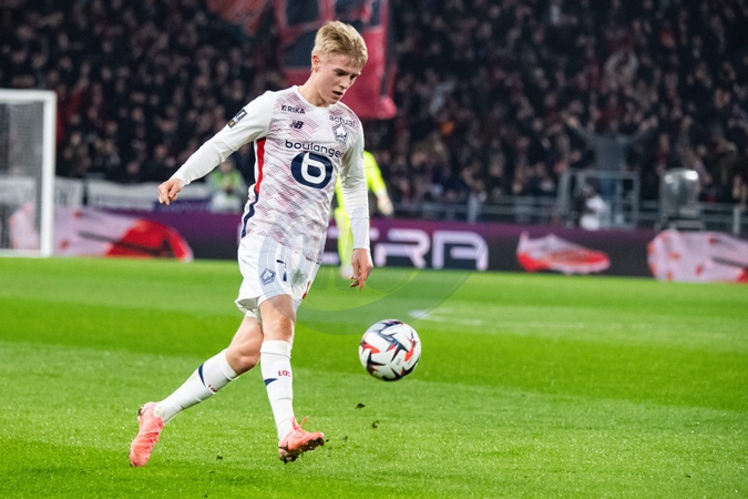 Hakon Arnar Haraldsson (Lille OSC) - Match de Ligue 1 McDonald's "Rennes - Lille (0-2)" au Roazhon Park, le 16 février 2025. Huit mois après son malaise cardio-respiratoire, le milieu de terrain Nabil Bentaleb, autorisé à jouer avec un défibrilateur, une première en Ligue 1, a ouvert le score pour son grand retour avec son équipe du LOSC. Ligue 1 McDonald's match "Rennes - Lille (0-2)" at Roazhon Park, February 16, 2025. Eight months after his cardio-respiratory malaise, midfielder Nabil Bentaleb, authorized to play with a defibrillator, a first in Ligue 1, opened the scoring for his big comeback with his LOSC team.