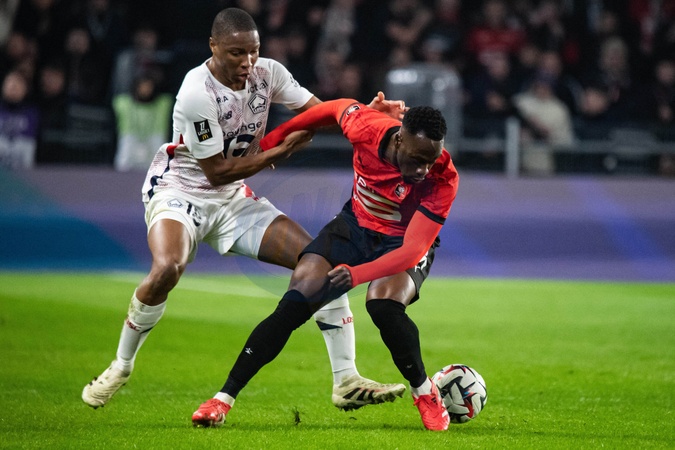 Bafodé Diakité (Lille OSC) Arnaud Kalimuendo (Stade Rennais) - Match de Ligue 1 McDonald's "Rennes - Lille (0-2)" au Roazhon Park, le 16 février 2025. Huit mois après son malaise cardio-respiratoire, le milieu de terrain Nabil Bentaleb, autorisé à jouer avec un défibrilateur, une première en Ligue 1, a ouvert le score pour son grand retour avec son équipe du LOSC. Ligue 1 McDonald's match "Rennes - Lille (0-2)" at Roazhon Park, February 16, 2025. Eight months after his cardio-respiratory malaise, midfielder Nabil Bentaleb, authorized to play with a defibrillator, a first in Ligue 1, opened the scoring for his big comeback with his LOSC team.