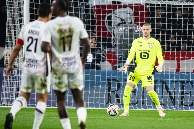 Lucas Chevalier (Lille OSC) - Match de Ligue 1 McDonald's "Rennes - Lille (0-2)" au Roazhon Park, le 16 février 2025. Huit mois après son malaise cardio-respiratoire, le milieu de terrain Nabil Bentaleb, autorisé à jouer avec un défibrilateur, une première en Ligue 1, a ouvert le score pour son grand retour avec son équipe du LOSC. Ligue 1 McDonald's match "Rennes - Lille (0-2)" at Roazhon Park, February 16, 2025. Eight months after his cardio-respiratory malaise, midfielder Nabil Bentaleb, authorized to play with a defibrillator, a first in Ligue 1, opened the scoring for his big comeback with his LOSC team.