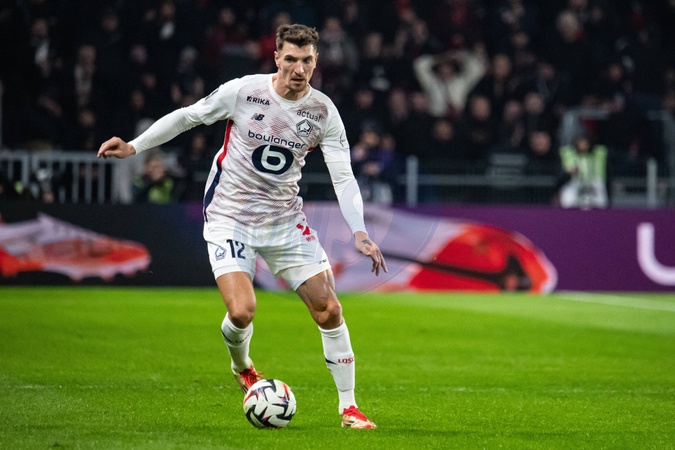 Thomas Meunier (Lille OSC) - Match de Ligue 1 McDonald's "Rennes - Lille (0-2)" au Roazhon Park, le 16 février 2025. Huit mois après son malaise cardio-respiratoire, le milieu de terrain Nabil Bentaleb, autorisé à jouer avec un défibrilateur, une première en Ligue 1, a ouvert le score pour son grand retour avec son équipe du LOSC. Ligue 1 McDonald's match "Rennes - Lille (0-2)" at Roazhon Park, February 16, 2025. Eight months after his cardio-respiratory malaise, midfielder Nabil Bentaleb, authorized to play with a defibrillator, a first in Ligue 1, opened the scoring for his big comeback with his LOSC team.