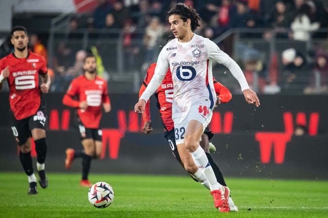 Ayyoub Bouaddi (Lille OSC) - Match de Ligue 1 McDonald's "Rennes - Lille (0-2)" au Roazhon Park, le 16 février 2025. Huit mois après son malaise cardio-respiratoire, le milieu de terrain Nabil Bentaleb, autorisé à jouer avec un défibrilateur, une première en Ligue 1, a ouvert le score pour son grand retour avec son équipe du LOSC. Ligue 1 McDonald's match "Rennes - Lille (0-2)" at Roazhon Park, February 16, 2025. Eight months after his cardio-respiratory malaise, midfielder Nabil Bentaleb, authorized to play with a defibrillator, a first in Ligue 1, opened the scoring for his big comeback with his LOSC team.