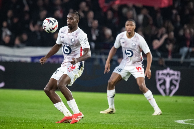 Ngal'ayel Mukau (Lille OSC) - Match de Ligue 1 McDonald's "Rennes - Lille (0-2)" au Roazhon Park, le 16 février 2025. Huit mois après son malaise cardio-respiratoire, le milieu de terrain Nabil Bentaleb, autorisé à jouer avec un défibrilateur, une première en Ligue 1, a ouvert le score pour son grand retour avec son équipe du LOSC. Ligue 1 McDonald's match "Rennes - Lille (0-2)" at Roazhon Park, February 16, 2025. Eight months after his cardio-respiratory malaise, midfielder Nabil Bentaleb, authorized to play with a defibrillator, a first in Ligue 1, opened the scoring for his big comeback with his LOSC team.