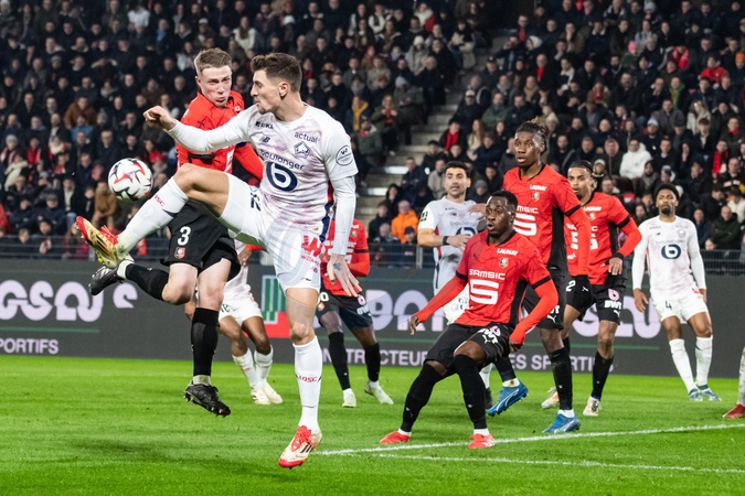 Thomas Meunier (Lille OSC) Adrien Truffert (Stade Rennais) - Match de Ligue 1 McDonald's "Rennes - Lille (0-2)" au Roazhon Park, le 16 février 2025. Huit mois après son malaise cardio-respiratoire, le milieu de terrain Nabil Bentaleb, autorisé à jouer avec un défibrilateur, une première en Ligue 1, a ouvert le score pour son grand retour avec son équipe du LOSC. Ligue 1 McDonald's match "Rennes - Lille (0-2)" at Roazhon Park, February 16, 2025. Eight months after his cardio-respiratory malaise, midfielder Nabil Bentaleb, authorized to play with a defibrillator, a first in Ligue 1, opened the scoring for his big comeback with his LOSC team.