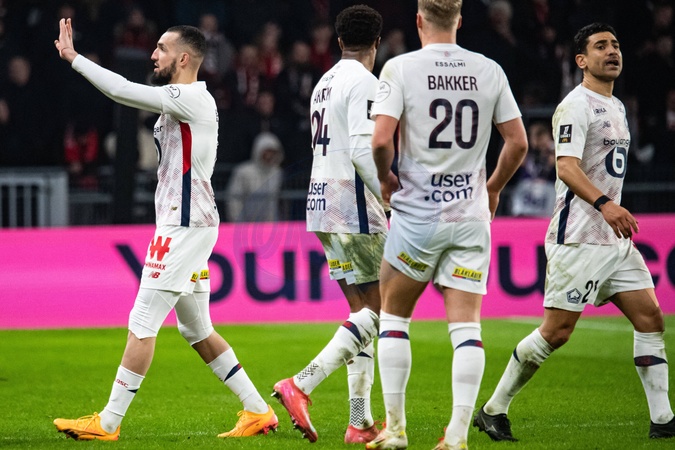 Joie des joueurs du LOSC aprés le but de Nabil Bentaleb (Lille OSC) - Match de Ligue 1 McDonald's "Rennes - Lille (0-2)" au Roazhon Park, le 16 février 2025. Huit mois après son malaise cardio-respiratoire, le milieu de terrain Nabil Bentaleb, autorisé à jouer avec un défibrilateur, une première en Ligue 1, a ouvert le score pour son grand retour avec son équipe du LOSC. Ligue 1 McDonald's match "Rennes - Lille (0-2)" at Roazhon Park, February 16, 2025. Eight months after his cardio-respiratory malaise, midfielder Nabil Bentaleb, authorized to play with a defibrillator, a first in Ligue 1, opened the scoring for his big comeback with his LOSC team.