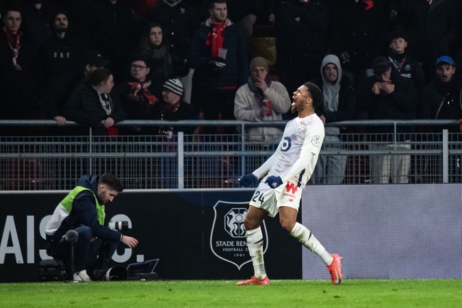 Joie des joueurs du LOSC aprés le but de Chuba Akpom (Lille OSC) - Match de Ligue 1 McDonald's "Rennes - Lille (0-2)" au Roazhon Park, le 16 février 2025. Huit mois après son malaise cardio-respiratoire, le milieu de terrain Nabil Bentaleb, autorisé à jouer avec un défibrilateur, une première en Ligue 1, a ouvert le score pour son grand retour avec son équipe du LOSC. Ligue 1 McDonald's match "Rennes - Lille (0-2)" at Roazhon Park, February 16, 2025. Eight months after his cardio-respiratory malaise, midfielder Nabil Bentaleb, authorized to play with a defibrillator, a first in Ligue 1, opened the scoring for his big comeback with his LOSC team.