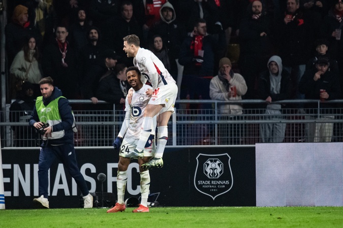 Joie des joueurs du LOSC aprés le but de Chuba Akpom (Lille OSC) - Match de Ligue 1 McDonald's "Rennes - Lille (0-2)" au Roazhon Park, le 16 février 2025. Huit mois après son malaise cardio-respiratoire, le milieu de terrain Nabil Bentaleb, autorisé à jouer avec un défibrilateur, une première en Ligue 1, a ouvert le score pour son grand retour avec son équipe du LOSC. Ligue 1 McDonald's match "Rennes - Lille (0-2)" at Roazhon Park, February 16, 2025. Eight months after his cardio-respiratory malaise, midfielder Nabil Bentaleb, authorized to play with a defibrillator, a first in Ligue 1, opened the scoring for his big comeback with his LOSC team.