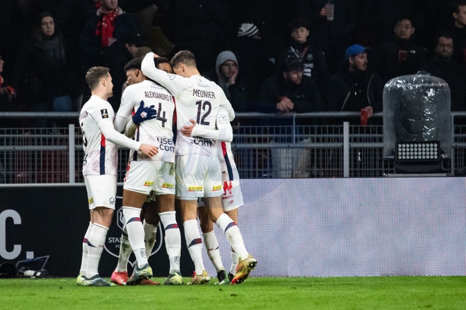 Joie des joueurs du LOSC aprés le but de Chuba Akpom (Lille OSC) - Match de Ligue 1 McDonald's "Rennes - Lille (0-2)" au Roazhon Park, le 16 février 2025. Huit mois après son malaise cardio-respiratoire, le milieu de terrain Nabil Bentaleb, autorisé à jouer avec un défibrilateur, une première en Ligue 1, a ouvert le score pour son grand retour avec son équipe du LOSC. Ligue 1 McDonald's match "Rennes - Lille (0-2)" at Roazhon Park, February 16, 2025. Eight months after his cardio-respiratory malaise, midfielder Nabil Bentaleb, authorized to play with a defibrillator, a first in Ligue 1, opened the scoring for his big comeback with his LOSC team.