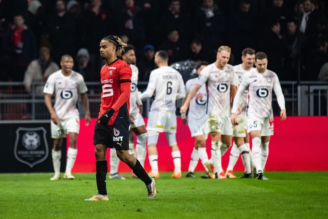 Déception de Lorenz Assignon (Stade Rennais) aprés le but de Chuba Akpom (Lille OSC) - Match de Ligue 1 McDonald's "Rennes - Lille (0-2)" au Roazhon Park, le 16 février 2025. Huit mois après son malaise cardio-respiratoire, le milieu de terrain Nabil Bentaleb, autorisé à jouer avec un défibrilateur, une première en Ligue 1, a ouvert le score pour son grand retour avec son équipe du LOSC. Ligue 1 McDonald's match "Rennes - Lille (0-2)" at Roazhon Park, February 16, 2025. Eight months after his cardio-respiratory malaise, midfielder Nabil Bentaleb, authorized to play with a defibrillator, a first in Ligue 1, opened the scoring for his big comeback with his LOSC team.