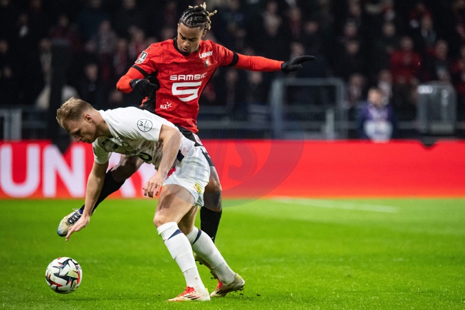 Lorenz Assignon (Stade Rennais) Mitchel Bakker (Lille OSC) - Match de Ligue 1 McDonald's "Rennes - Lille (0-2)" au Roazhon Park, le 16 février 2025. Huit mois après son malaise cardio-respiratoire, le milieu de terrain Nabil Bentaleb, autorisé à jouer avec un défibrilateur, une première en Ligue 1, a ouvert le score pour son grand retour avec son équipe du LOSC. Ligue 1 McDonald's match "Rennes - Lille (0-2)" at Roazhon Park, February 16, 2025. Eight months after his cardio-respiratory malaise, midfielder Nabil Bentaleb, authorized to play with a defibrillator, a first in Ligue 1, opened the scoring for his big comeback with his LOSC team.