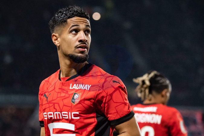 Ludovic Blas (Stade Rennais) - Match de Ligue 1 McDonald's "Rennes - Lille (0-2)" au Roazhon Park, le 16 février 2025. Huit mois après son malaise cardio-respiratoire, le milieu de terrain Nabil Bentaleb, autorisé à jouer avec un défibrilateur, une première en Ligue 1, a ouvert le score pour son grand retour avec son équipe du LOSC. Ligue 1 McDonald's match "Rennes - Lille (0-2)" at Roazhon Park, February 16, 2025. Eight months after his cardio-respiratory malaise, midfielder Nabil Bentaleb, authorized to play with a defibrillator, a first in Ligue 1, opened the scoring for his big comeback with his LOSC team.