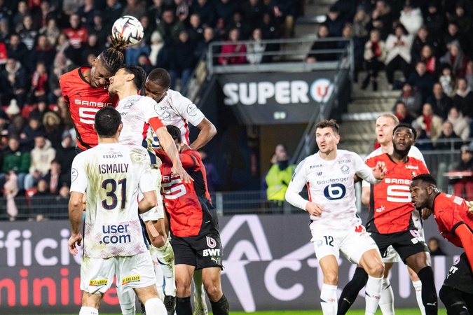 Christopher Wooh (Stade Rennais) Benjamin André (Lille OSC) - Match de Ligue 1 McDonald's "Rennes - Lille (0-2)" au Roazhon Park, le 16 février 2025. Huit mois après son malaise cardio-respiratoire, le milieu de terrain Nabil Bentaleb, autorisé à jouer avec un défibrilateur, une première en Ligue 1, a ouvert le score pour son grand retour avec son équipe du LOSC. Ligue 1 McDonald's match "Rennes - Lille (0-2)" at Roazhon Park, February 16, 2025. Eight months after his cardio-respiratory malaise, midfielder Nabil Bentaleb, authorized to play with a defibrillator, a first in Ligue 1, opened the scoring for his big comeback with his LOSC team.