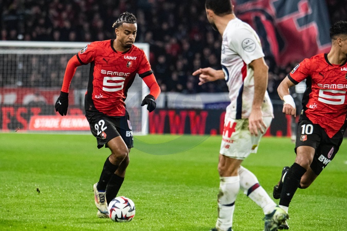 Lorenz Assignon (Stade Rennais) - Match de Ligue 1 McDonald's "Rennes - Lille (0-2)" au Roazhon Park, le 16 février 2025. Huit mois après son malaise cardio-respiratoire, le milieu de terrain Nabil Bentaleb, autorisé à jouer avec un défibrilateur, une première en Ligue 1, a ouvert le score pour son grand retour avec son équipe du LOSC. Ligue 1 McDonald's match "Rennes - Lille (0-2)" at Roazhon Park, February 16, 2025. Eight months after his cardio-respiratory malaise, midfielder Nabil Bentaleb, authorized to play with a defibrillator, a first in Ligue 1, opened the scoring for his big comeback with his LOSC team.
