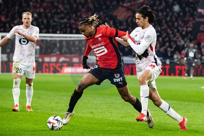 Lorenz Assignon (Stade Rennais) Ayyoub Bouaddi (Lille OSC) - Match de Ligue 1 McDonald's "Rennes - Lille (0-2)" au Roazhon Park, le 16 février 2025. Huit mois après son malaise cardio-respiratoire, le milieu de terrain Nabil Bentaleb, autorisé à jouer avec un défibrilateur, une première en Ligue 1, a ouvert le score pour son grand retour avec son équipe du LOSC. Ligue 1 McDonald's match "Rennes - Lille (0-2)" at Roazhon Park, February 16, 2025. Eight months after his cardio-respiratory malaise, midfielder Nabil Bentaleb, authorized to play with a defibrillator, a first in Ligue 1, opened the scoring for his big comeback with his LOSC team.