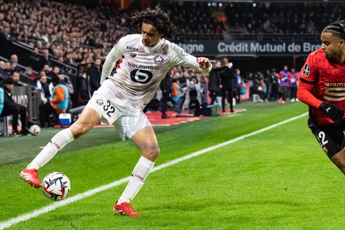 Ayyoub Bouaddi (Lille OSC) - Match de Ligue 1 McDonald's "Rennes - Lille (0-2)" au Roazhon Park, le 16 février 2025. Huit mois après son malaise cardio-respiratoire, le milieu de terrain Nabil Bentaleb, autorisé à jouer avec un défibrilateur, une première en Ligue 1, a ouvert le score pour son grand retour avec son équipe du LOSC. Ligue 1 McDonald's match "Rennes - Lille (0-2)" at Roazhon Park, February 16, 2025. Eight months after his cardio-respiratory malaise, midfielder Nabil Bentaleb, authorized to play with a defibrillator, a first in Ligue 1, opened the scoring for his big comeback with his LOSC team.