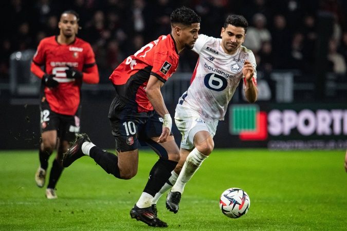 Ludovic Blas (Stade Rennais) - Match de Ligue 1 McDonald's "Rennes - Lille (0-2)" au Roazhon Park, le 16 février 2025. Huit mois après son malaise cardio-respiratoire, le milieu de terrain Nabil Bentaleb, autorisé à jouer avec un défibrilateur, une première en Ligue 1, a ouvert le score pour son grand retour avec son équipe du LOSC. Ligue 1 McDonald's match "Rennes - Lille (0-2)" at Roazhon Park, February 16, 2025. Eight months after his cardio-respiratory malaise, midfielder Nabil Bentaleb, authorized to play with a defibrillator, a first in Ligue 1, opened the scoring for his big comeback with his LOSC team.