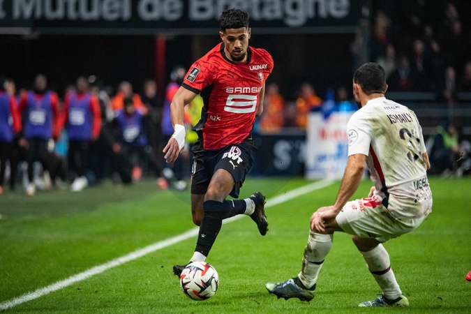 Ludovic Blas (Stade Rennais) - Match de Ligue 1 McDonald's "Rennes - Lille (0-2)" au Roazhon Park, le 16 février 2025. Huit mois après son malaise cardio-respiratoire, le milieu de terrain Nabil Bentaleb, autorisé à jouer avec un défibrilateur, une première en Ligue 1, a ouvert le score pour son grand retour avec son équipe du LOSC. Ligue 1 McDonald's match "Rennes - Lille (0-2)" at Roazhon Park, February 16, 2025. Eight months after his cardio-respiratory malaise, midfielder Nabil Bentaleb, authorized to play with a defibrillator, a first in Ligue 1, opened the scoring for his big comeback with his LOSC team.