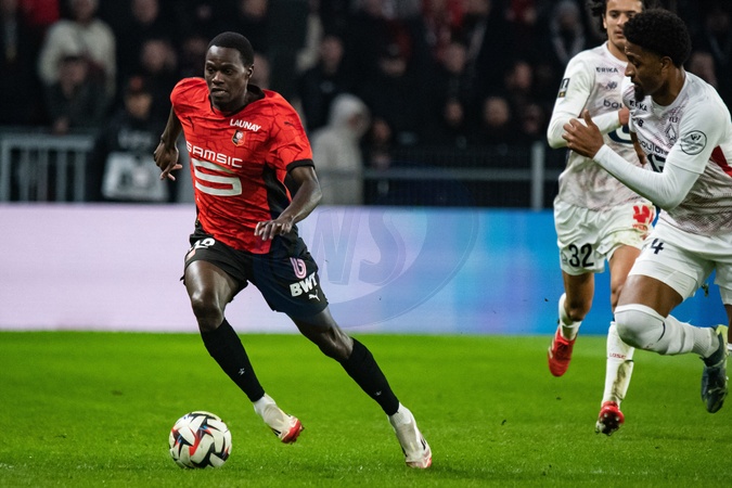 Naouirou Ahmada (Stade Rennais) - Match de Ligue 1 McDonald's "Rennes - Lille (0-2)" au Roazhon Park, le 16 février 2025. Huit mois après son malaise cardio-respiratoire, le milieu de terrain Nabil Bentaleb, autorisé à jouer avec un défibrilateur, une première en Ligue 1, a ouvert le score pour son grand retour avec son équipe du LOSC. Ligue 1 McDonald's match "Rennes - Lille (0-2)" at Roazhon Park, February 16, 2025. Eight months after his cardio-respiratory malaise, midfielder Nabil Bentaleb, authorized to play with a defibrillator, a first in Ligue 1, opened the scoring for his big comeback with his LOSC team.