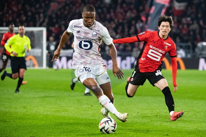 Bafodé Diakité (Lille OSC) - Match de Ligue 1 McDonald's "Rennes - Lille (0-2)" au Roazhon Park, le 16 février 2025. Huit mois après son malaise cardio-respiratoire, le milieu de terrain Nabil Bentaleb, autorisé à jouer avec un défibrilateur, une première en Ligue 1, a ouvert le score pour son grand retour avec son équipe du LOSC. Ligue 1 McDonald's match "Rennes - Lille (0-2)" at Roazhon Park, February 16, 2025. Eight months after his cardio-respiratory malaise, midfielder Nabil Bentaleb, authorized to play with a defibrillator, a first in Ligue 1, opened the scoring for his big comeback with his LOSC team.