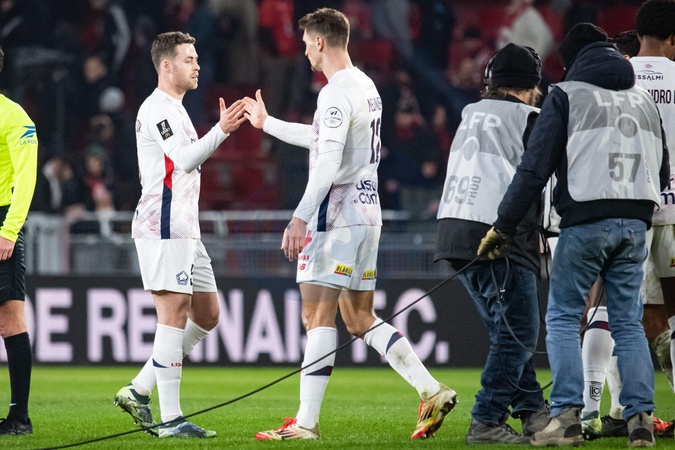 Gabriel Gudmundsson (Lille OSC) Thomas Meunier (Lille OSC) - Match de Ligue 1 McDonald's "Rennes - Lille (0-2)" au Roazhon Park, le 16 février 2025. Huit mois après son malaise cardio-respiratoire, le milieu de terrain Nabil Bentaleb, autorisé à jouer avec un défibrilateur, une première en Ligue 1, a ouvert le score pour son grand retour avec son équipe du LOSC. Ligue 1 McDonald's match "Rennes - Lille (0-2)" at Roazhon Park, February 16, 2025. Eight months after his cardio-respiratory malaise, midfielder Nabil Bentaleb, authorized to play with a defibrillator, a first in Ligue 1, opened the scoring for his big comeback with his LOSC team.