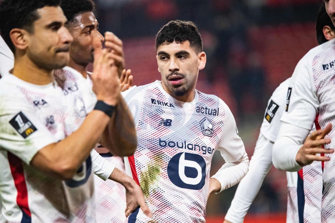 Osame Sahraoui (Lille OSC) - Match de Ligue 1 McDonald's "Rennes - Lille (0-2)" au Roazhon Park, le 16 février 2025. Huit mois après son malaise cardio-respiratoire, le milieu de terrain Nabil Bentaleb, autorisé à jouer avec un défibrilateur, une première en Ligue 1, a ouvert le score pour son grand retour avec son équipe du LOSC. Ligue 1 McDonald's match "Rennes - Lille (0-2)" at Roazhon Park, February 16, 2025. Eight months after his cardio-respiratory malaise, midfielder Nabil Bentaleb, authorized to play with a defibrillator, a first in Ligue 1, opened the scoring for his big comeback with his LOSC team.