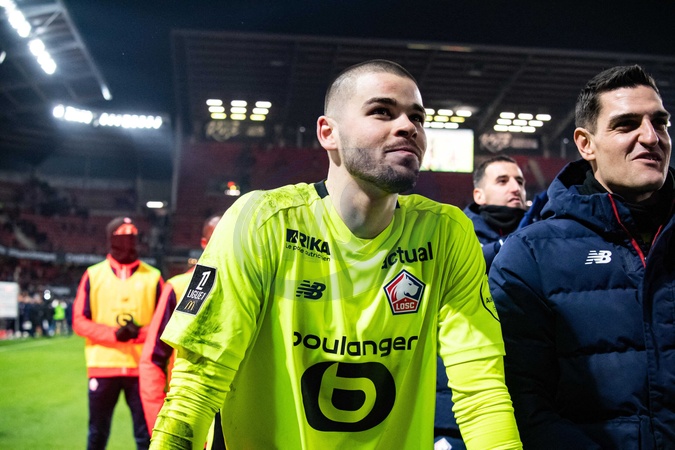 Lucas Chevalier (Lille OSC) - Match de Ligue 1 McDonald's "Rennes - Lille (0-2)" au Roazhon Park, le 16 février 2025. Huit mois après son malaise cardio-respiratoire, le milieu de terrain Nabil Bentaleb, autorisé à jouer avec un défibrilateur, une première en Ligue 1, a ouvert le score pour son grand retour avec son équipe du LOSC. Ligue 1 McDonald's match "Rennes - Lille (0-2)" at Roazhon Park, February 16, 2025. Eight months after his cardio-respiratory malaise, midfielder Nabil Bentaleb, authorized to play with a defibrillator, a first in Ligue 1, opened the scoring for his big comeback with his LOSC team.