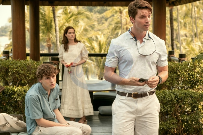 Sam Nivola Sarah Catherine Hook Patrick Schwarzenegger in Season 3 Episode 1 of The White Lotus, Credit:Fabio Lovino/HBO / Avalon