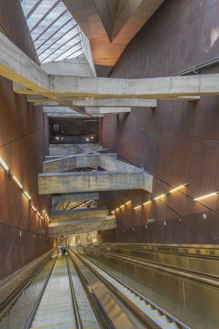 Hungary, Budapest, The Fovam Ter underground railway station with criss-crossing concrete beams is by Hungarian firm Spora Architects. Three levels of reinforced concrete beams rise up through a void above, Credit:Fabio Mazzarella / Avalon