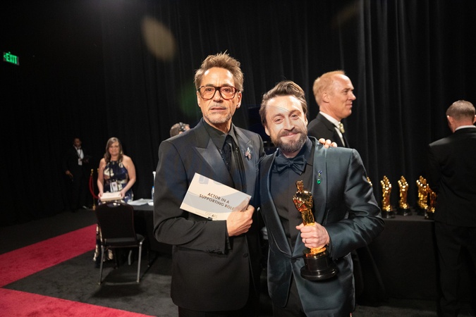 Robert Downey Jr. and Kieran Culkin pose backstage with the Oscar® for Best Supporting Actor during the live ABC Telecast of the 97th Oscars® at Dolby® Theatre at Ovation Hollywood on Sunday, March 2, 2025., Credit:A.M.P.A.S. / Avalon