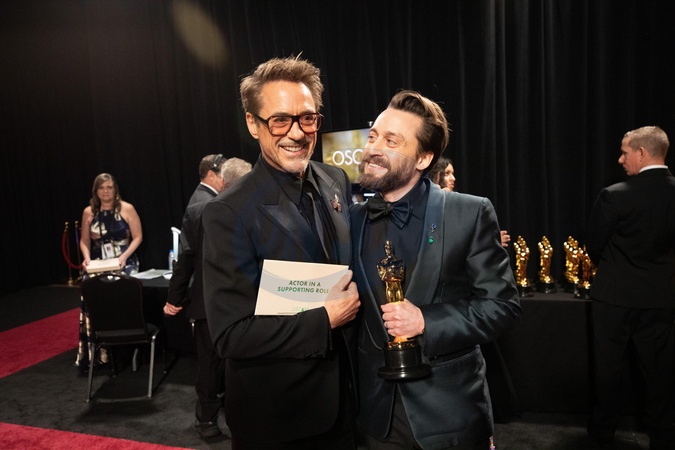 Robert Downey Jr. and Kieran Culkin pose backstage with the Oscar® for Best Supporting Actor during the live ABC Telecast of the 97th Oscars® at Dolby® Theatre at Ovation Hollywood on Sunday, March 2, 2025., Credit:A.M.P.A.S. / Avalon