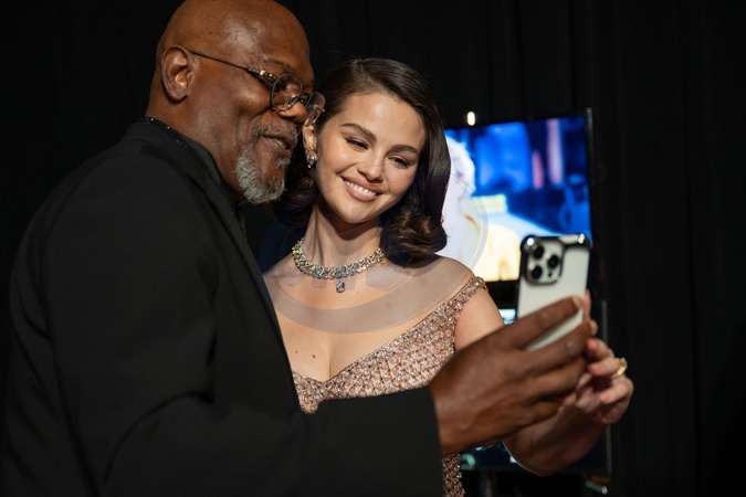 Samuel L. Jackson and Selena Gomez backstage with the Oscar® for Production Design during the live ABC Telecast of the 97th Oscars® at Dolby® Theatre at Ovation Hollywood on Sunday, March 2, 2025., Credit:A.M.P.A.S. / Avalon