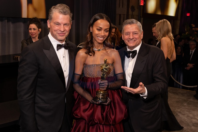 Zoe Saldaña (center) and Ted Sarandos attend the Governors Ball following the live ABC telecast of the 97th Oscars® at the Dolby® Theatre at Ovation Hollywood in Los Angeles, CA, on Sunday, March 2, 2025., Credit:A.M.P.A.S. / Avalon