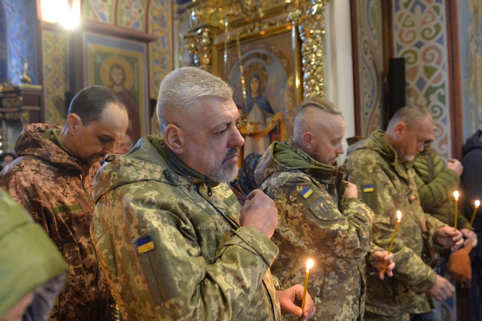 Soldiers cross themselves during a memorial service for Vasyl Ratushnyi, a serviceman of the 414th Strike UAV Brigade who was killed while on a mission on the front line on February 27, 2025, at St Michael's Cathedral, Kyiv, Ukraine, on March 5, 2025. Vasyl Ratushnyi was the elder brother of famous Ukrainian activist Roman Ratushnyi who was killed in action in Kharkiv region in June 2022. (Photo by Oleksandr Klymenko/Ukrinform), Credit:Oleksandr Klymenko / Avalon