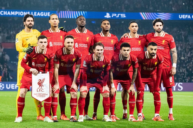 Photo d'equipe du FC Liverpool - 1/8e de finale aller de la Ligue des champions 2024-25 entre le PSG contre Liverpool (0-1) au Parc des Princes à Paris le 5 mars 2025. 1/8th final first leg of the 2024-25 Champions League between PSG against Liverpool (0-1) at the Parc des Princes in Paris on March 5, 2025.
