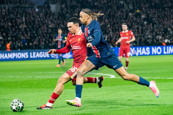 Bradley Barcola (Paris SG) Trent Alexander-Arnold (FC Liverpool) - 1/8e de finale aller de la Ligue des champions 2024-25 entre le PSG contre Liverpool (0-1) au Parc des Princes à Paris le 5 mars 2025. 1/8th final first leg of the 2024-25 Champions League between PSG against Liverpool (0-1) at the Parc des Princes in Paris on March 5, 2025.