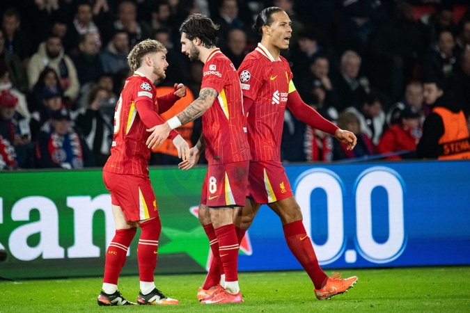 Joie des joueurs du FC Liverpool aprés le but de Harvey Elliott (FC Liverpool) - 1/8e de finale aller de la Ligue des champions 2024-25 entre le PSG contre Liverpool (0-1) au Parc des Princes à Paris le 5 mars 2025. 1/8th final first leg of the 2024-25 Champions League between PSG against Liverpool (0-1) at the Parc des Princes in Paris on March 5, 2025.