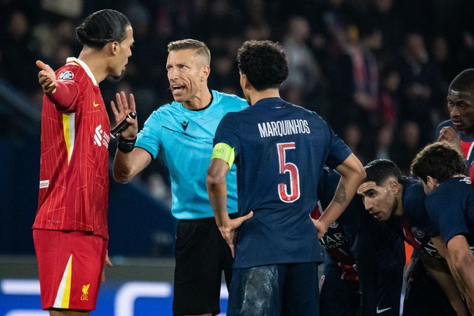 Davide Massa (Arbitre Central) Virgil van Dijk (FC Liverpool) - 1/8e de finale aller de la Ligue des champions 2024-25 entre le PSG contre Liverpool (0-1) au Parc des Princes à Paris le 5 mars 2025. 1/8th final first leg of the 2024-25 Champions League between PSG against Liverpool (0-1) at the Parc des Princes in Paris on March 5, 2025.