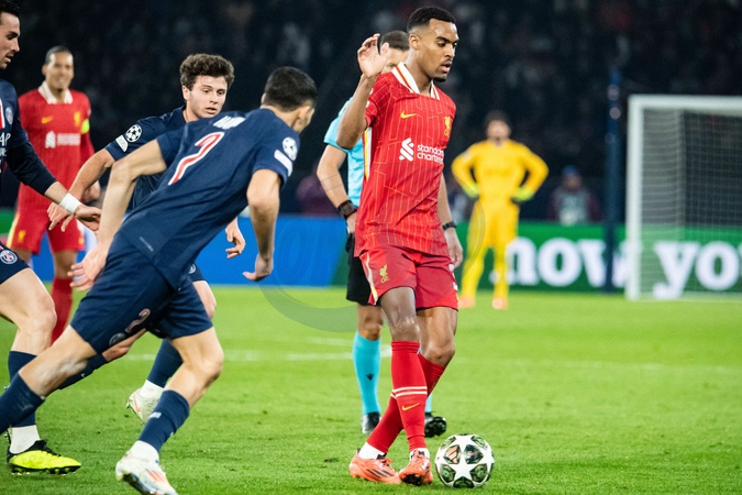 Ryan Gravenberch (FC Liverpool) - 1/8e de finale aller de la Ligue des champions 2024-25 entre le PSG contre Liverpool (0-1) au Parc des Princes à Paris le 5 mars 2025. 1/8th final first leg of the 2024-25 Champions League between PSG against Liverpool (0-1) at the Parc des Princes in Paris on March 5, 2025.