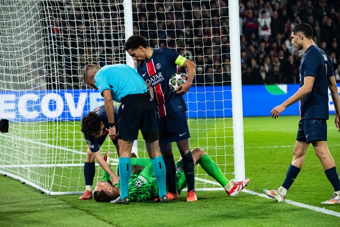 Davide Massa (Arbitre Central) Marquinhos (Paris SG) Gianluigi Donnarumma (Paris SG) Vitinha (Paris SG) - 1/8e de finale aller de la Ligue des champions 2024-25 entre le PSG contre Liverpool (0-1) au Parc des Princes à Paris le 5 mars 2025. 1/8th final first leg of the 2024-25 Champions League between PSG against Liverpool (0-1) at the Parc des Princes in Paris on March 5, 2025.