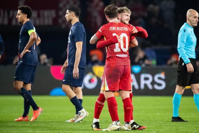 Joie des joueurs du FC Liverpool aprés la fin du match - 1/8e de finale aller de la Ligue des champions 2024-25 entre le PSG contre Liverpool (0-1) au Parc des Princes à Paris le 5 mars 2025. 1/8th final first leg of the 2024-25 Champions League between PSG against Liverpool (0-1) at the Parc des Princes in Paris on March 5, 2025.