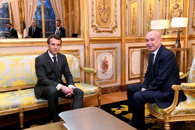 Le président Emmanuel Macron lors d'un entretien avec M. Claude Malhuret président du groupe Les Indépendants-République et territoires (LIRT) au Sénat, au palais de l'Elysée à Paris